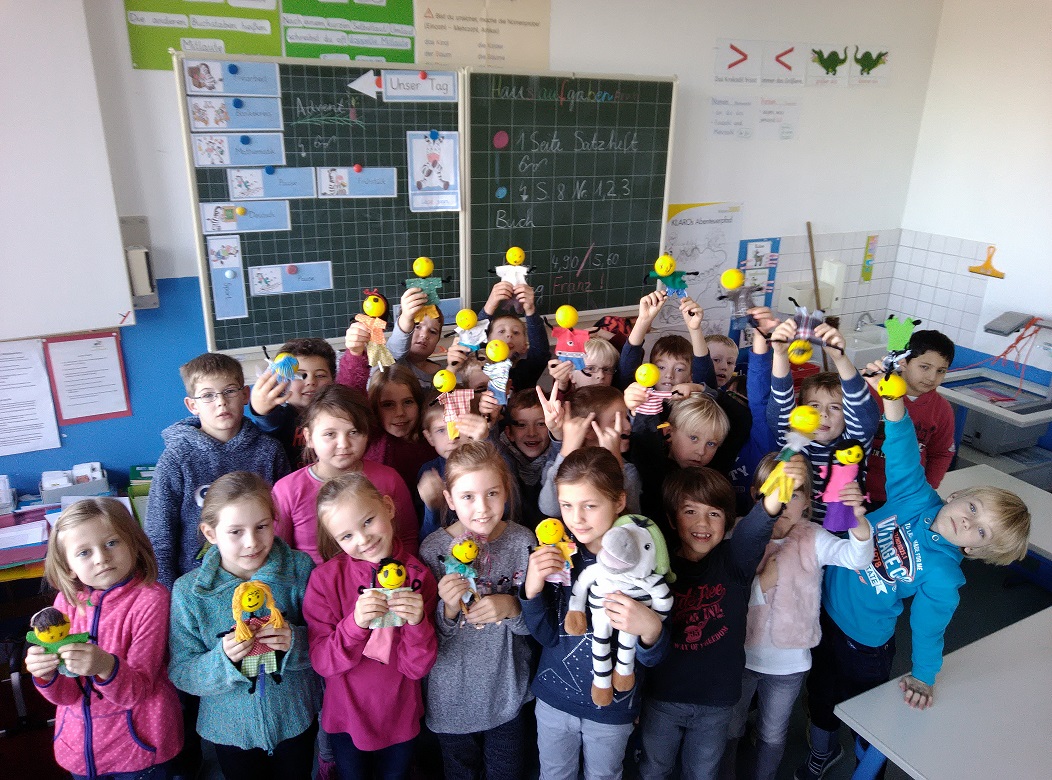 !Die Kinder der Klasse 1b freuen sich über ihre gebastelten KLARO - Puppen